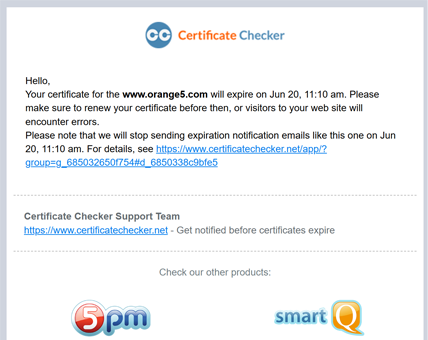 That's where Certificate Checker comes in. It keeps an eye on the certificate expiration date and sends a heads-up a week in advance, so you can resolve issues before they cause trouble and issue an updated certificate in time. Thus, you can avoid the consequences of things like missed manual renewals, forgotten certificates, or broken configurations that break the automatic renewal process.